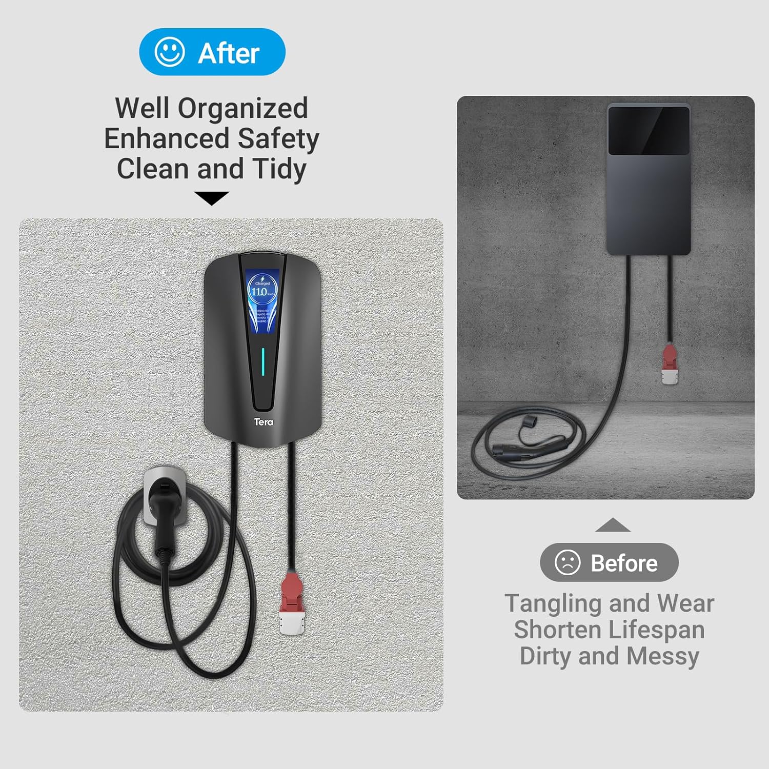 【Diseño elegante y práctico que ahorra espacio】 El soporte para cargador Tera EV combina estilo y practicidad con su diseño elegante y moderno. El diseño cuidadosamente elaborado optimiza el uso del espacio, permitiéndole organizar y almacenar el cargador de forma ordenada cuando no esté en uso. Esta característica de ahorro de espacio es especialmente beneficiosa para quienes tienen espacio de carga limitado o desean mantener un ambiente limpio y ordenado.