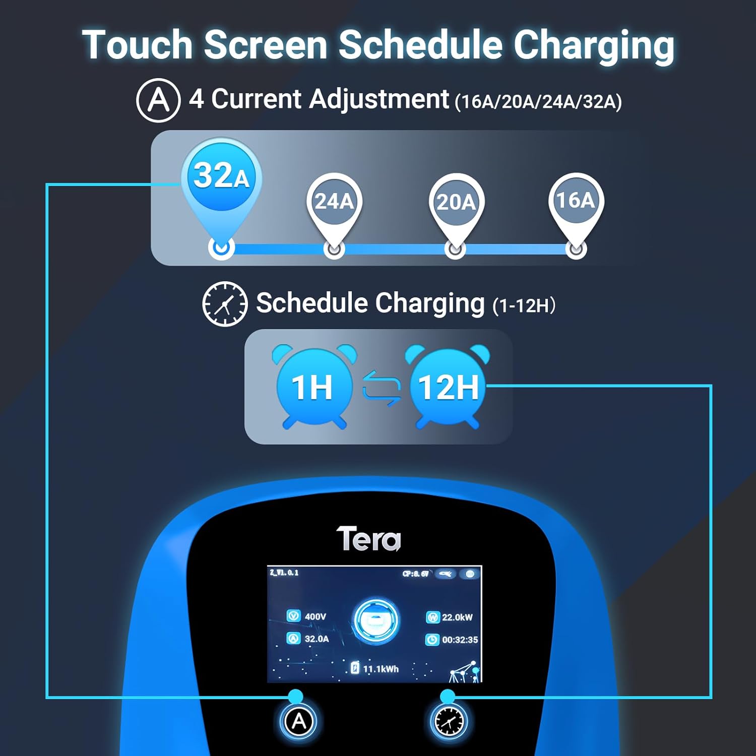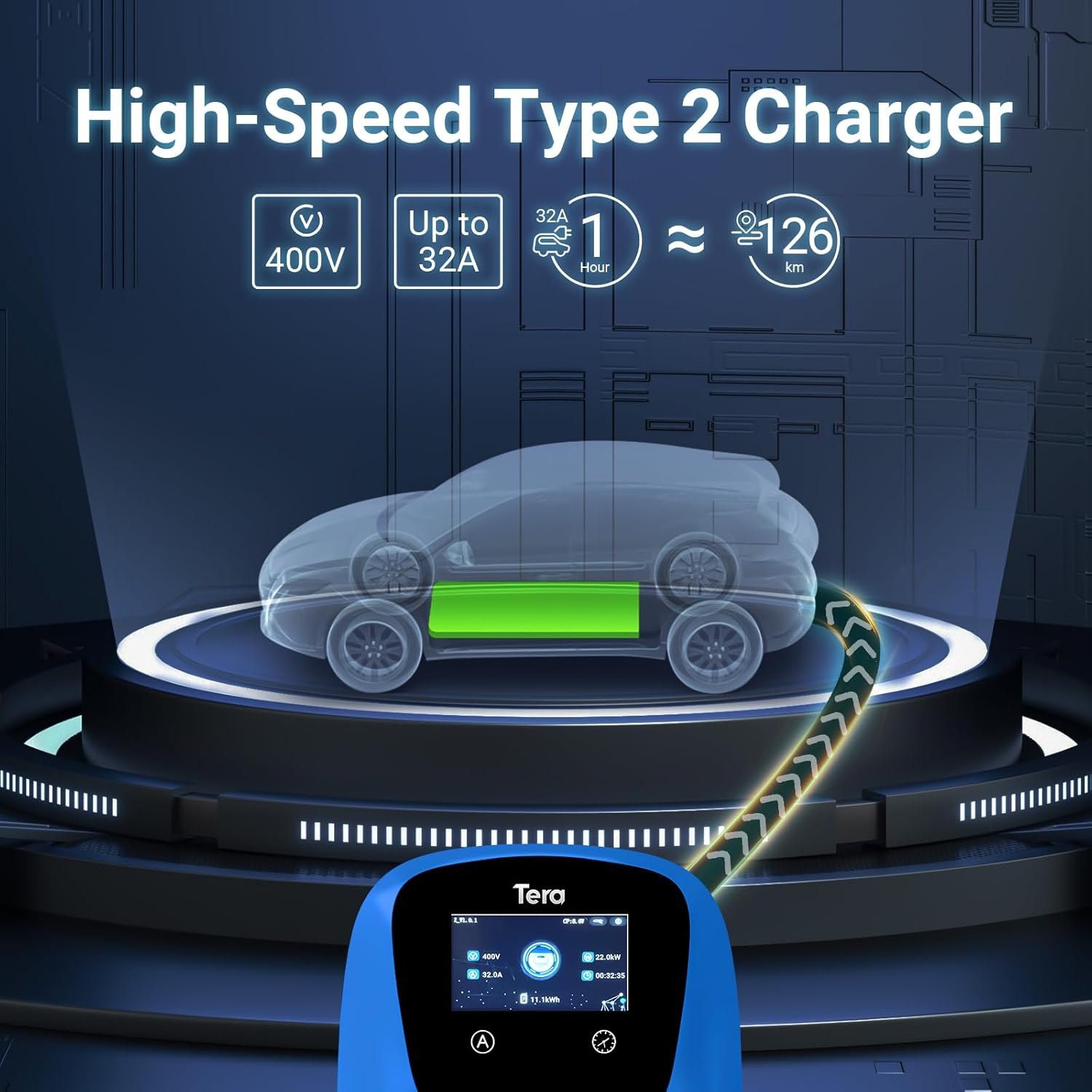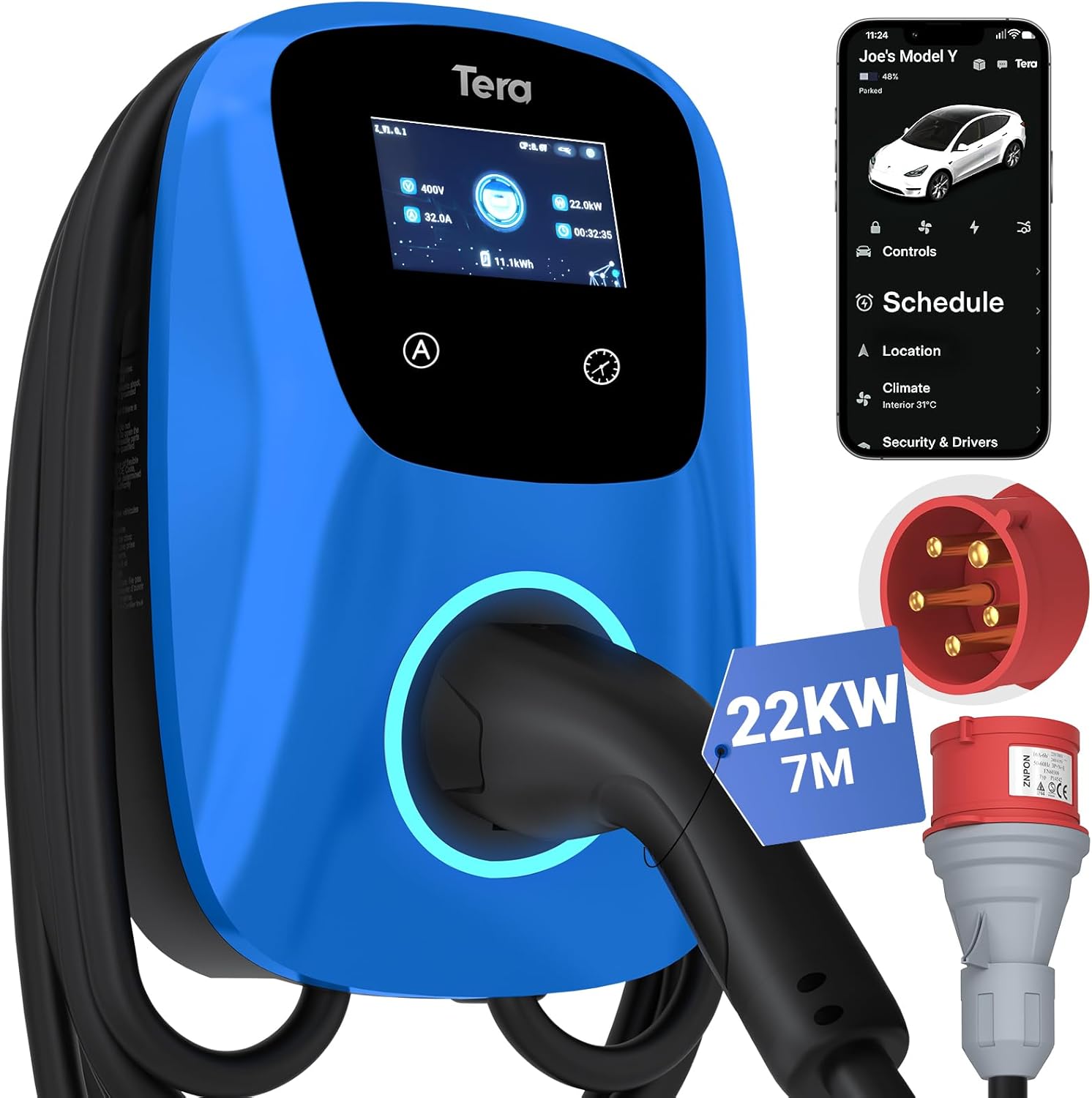 Tera EV Smart App Charger: 32A Type 2 22kW Home Charging Station 400V CE and TÜV 7m Charging Cable with Charging Stand App Control CEE 3 Phase Connector for Bright Blue