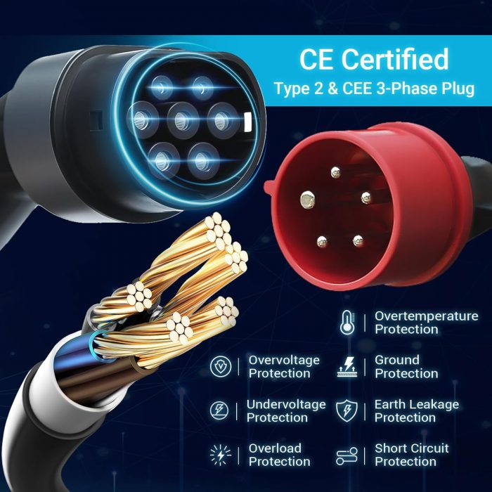 【CE Certified Copper Charging Cable】With copper purity over 99.5%, the electric vehicle charger ensures excellent conductivity, fast charging, waterproof performance and minimal heat production. Compared with conventional alloy copper charging cables available on the market, our electric vehicle charger offers more stable current output and higher safety. CE certification number (charging cable) length 6m