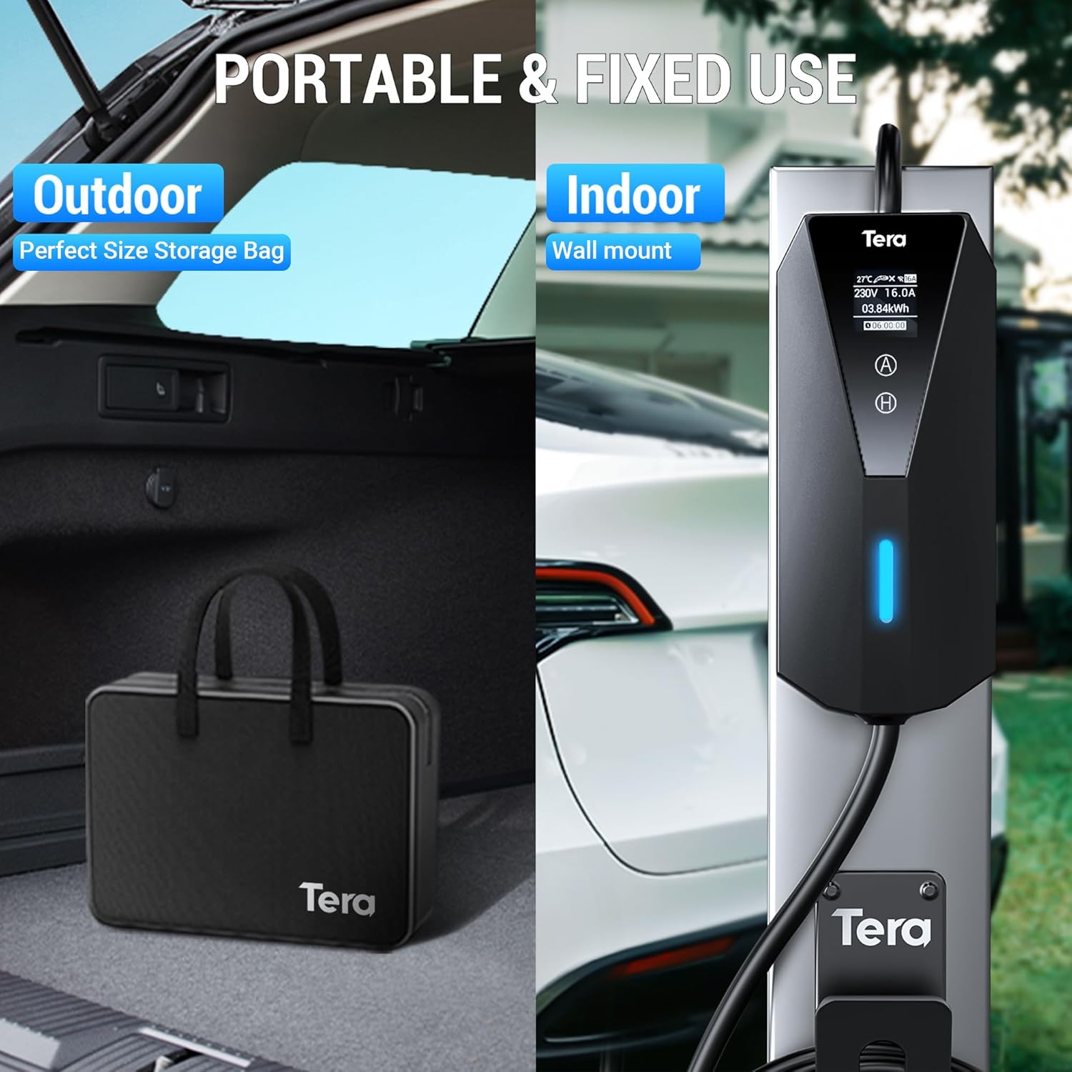 Fast Charging: Tera tpy 2 Schuko portable charger for electric vehicles, with 4-level adjustable current buttons: 6A/8A/10A/13A/16A, input voltage 200-240V. The maximum output power is 3.8 kW, three times faster than standard sockets.