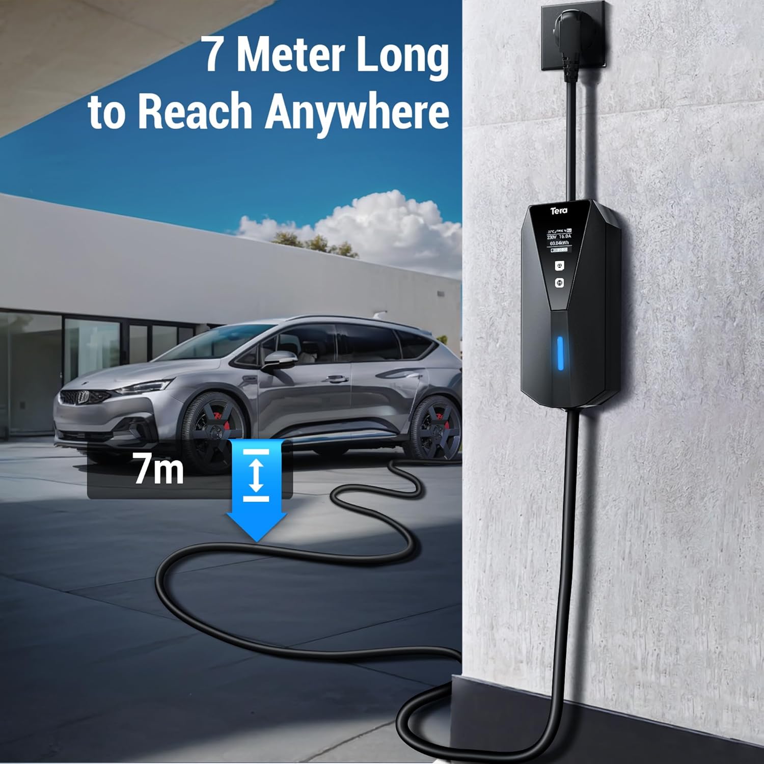 CAN BE USED ANYWHERE – 7m long cable, equipped with IEC 62196-2 type 2 charging cable to meet daily charging needs. A storage bag and cable tie are included, making it easy to store in the trunk of the car during travel or business trip. There is also a cable collector holder for home use. It only needs a grounded plug to use it anywhere.