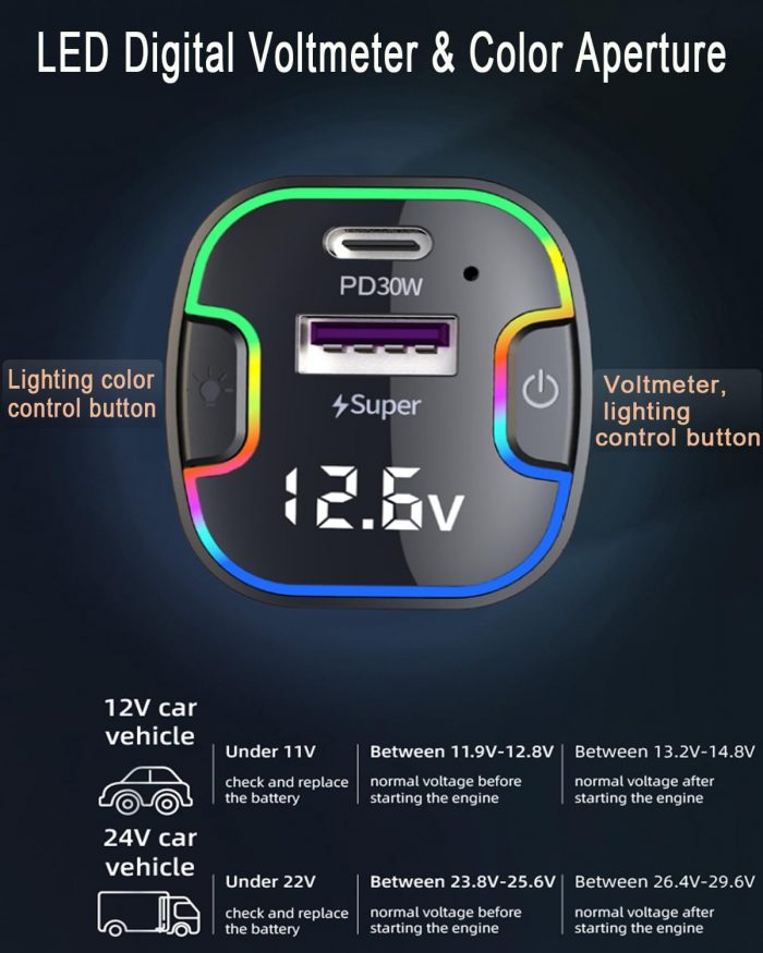 【Colorful Lights and Digital Voltmeter】This car charger adapter can track the status of your car battery in real time after turning it on, so you can easily know the status of your car’s battery. Equipped with LED indicator light, you can easily find the charging port even in the dark, and with a switch, you can turn off the indicator light at any time when you don’t need it.