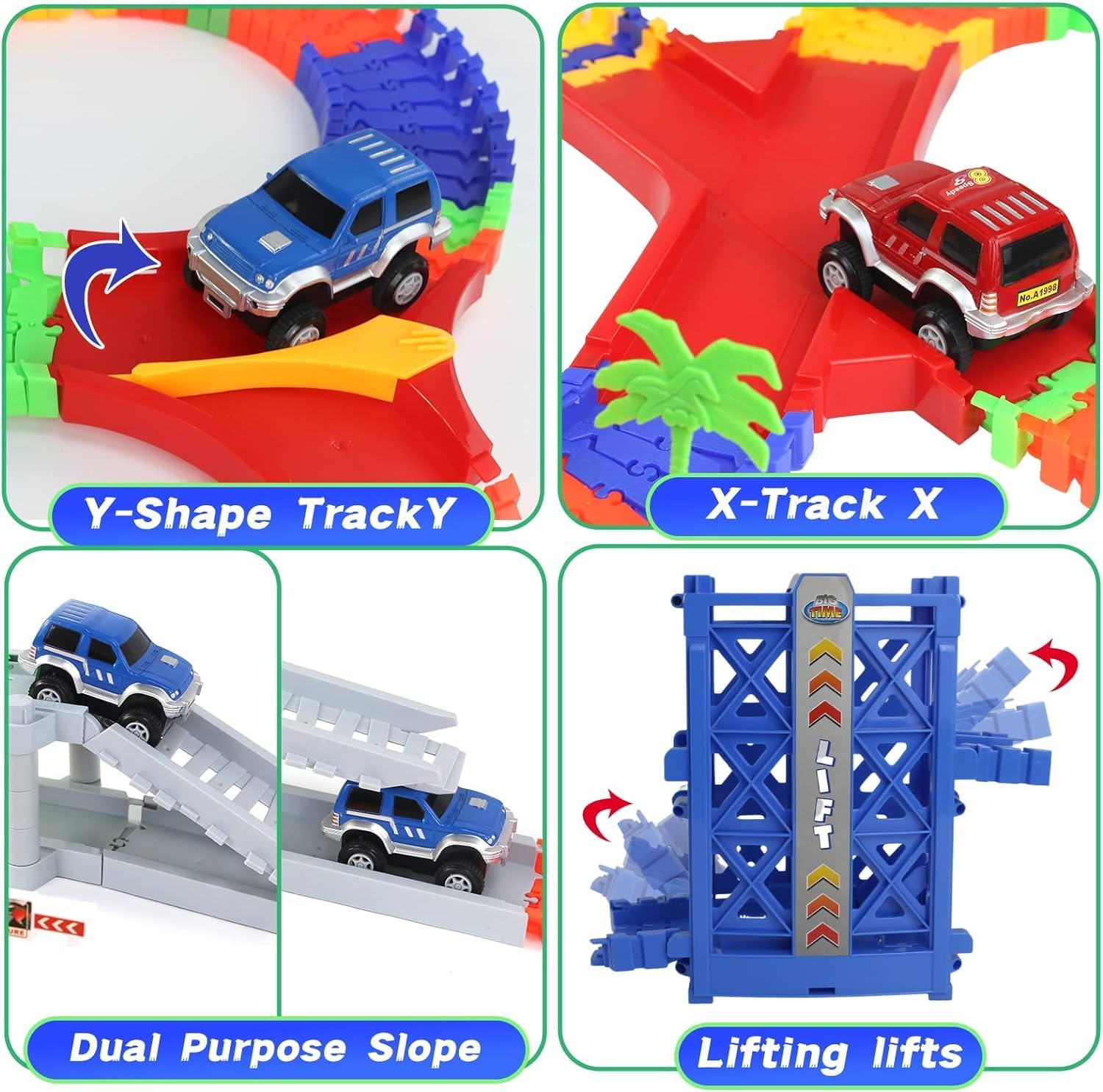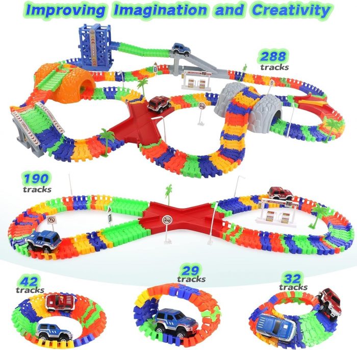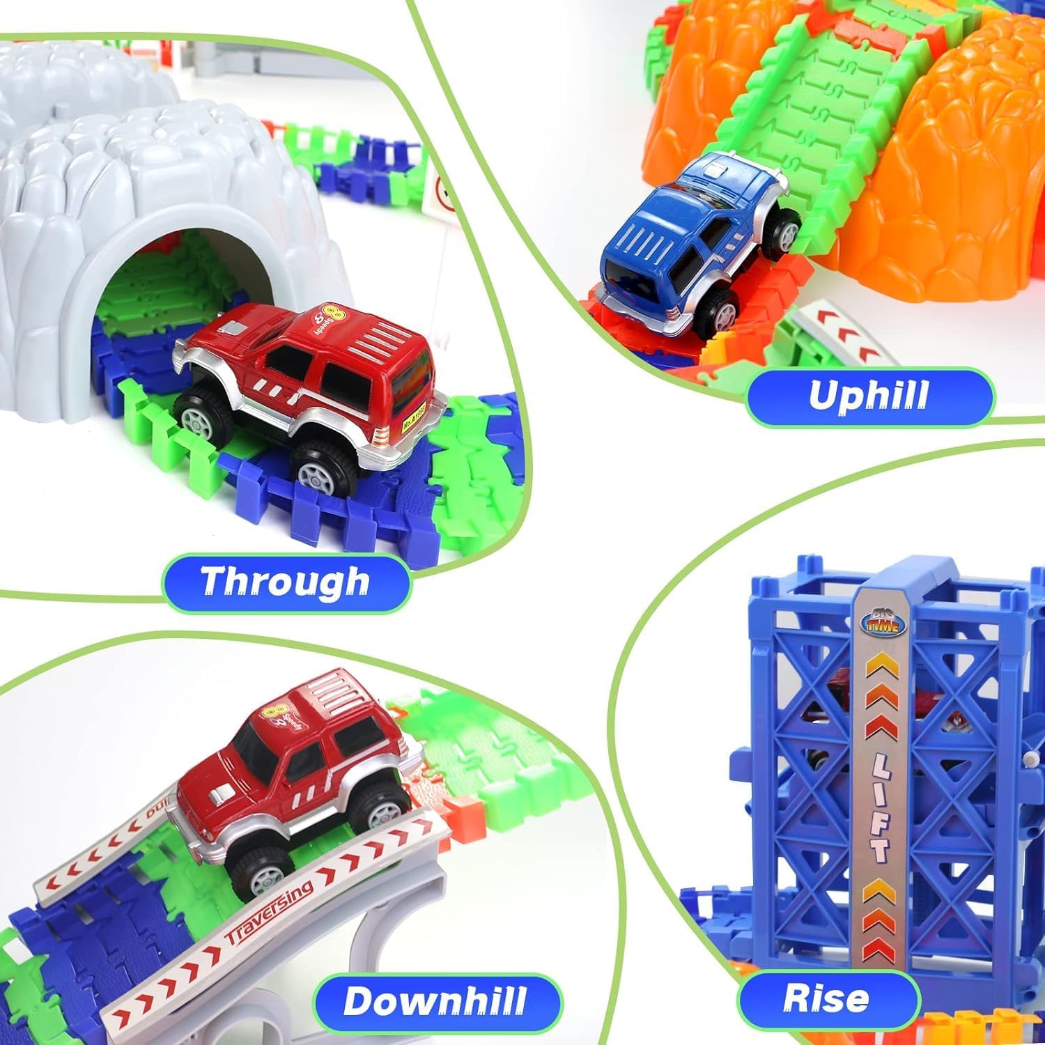Circuit cars children luminous racing features 2 electronic cars with 288 pieces of tracks, 5.05 meters in length in total.