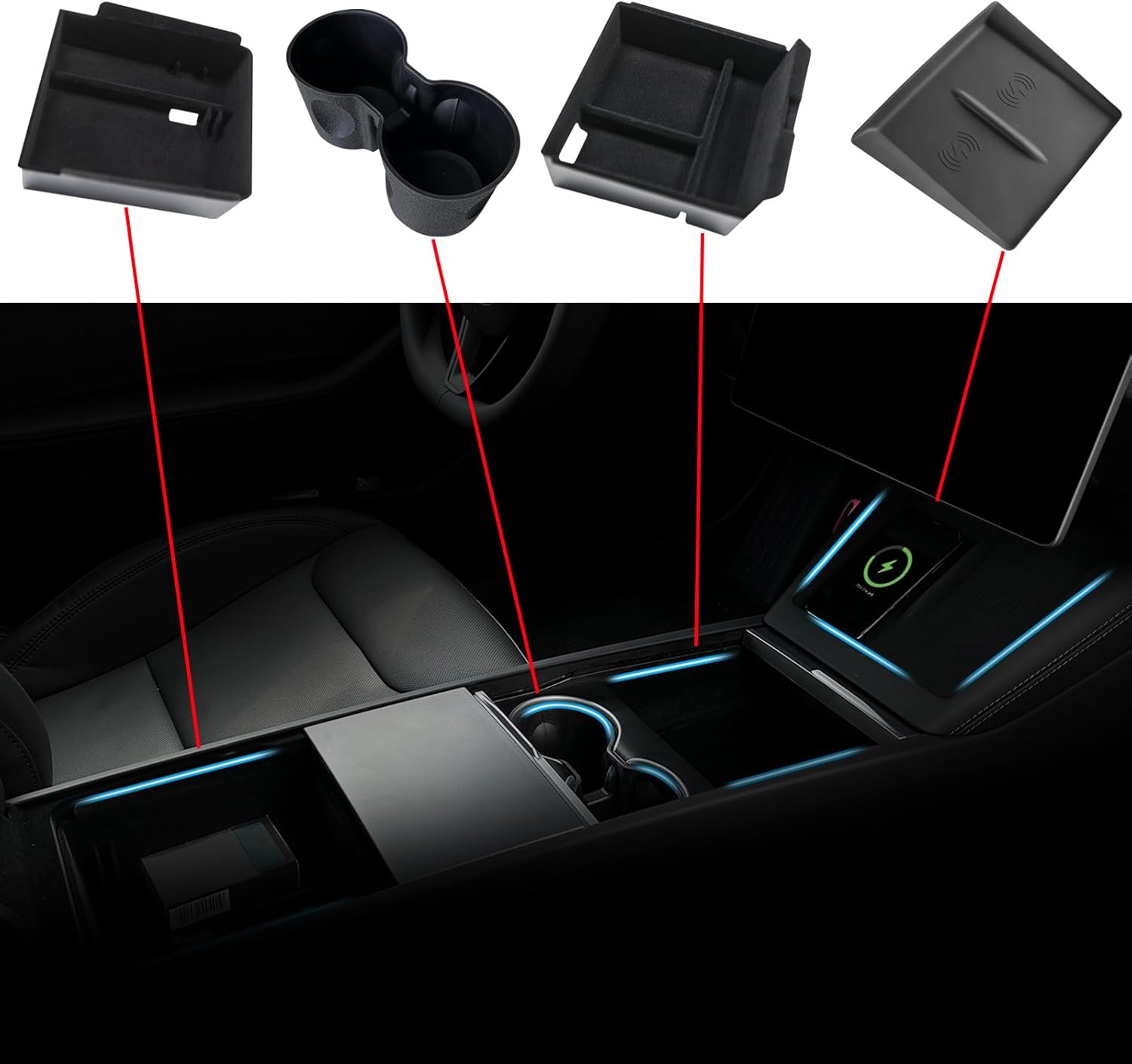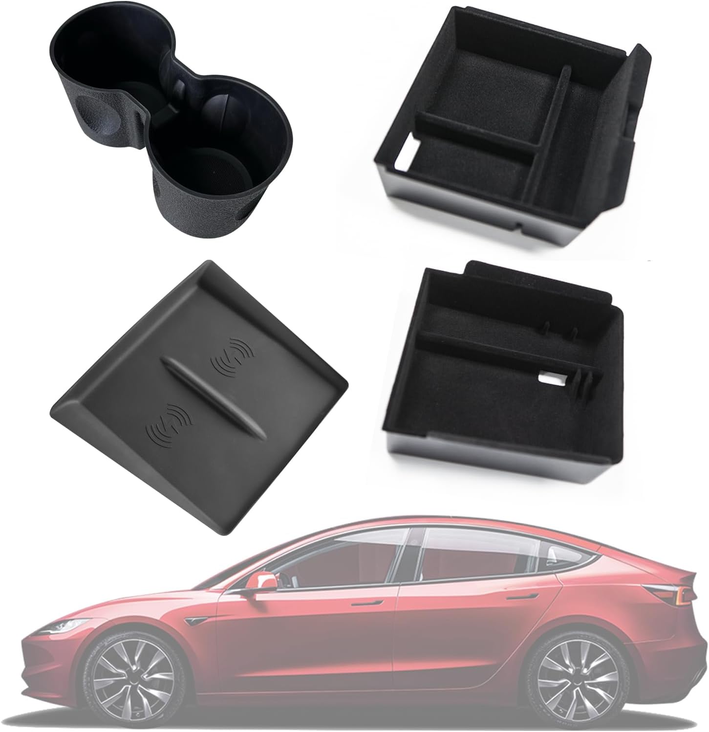 WHAT YOU GET: 1 x Front Center Control Storage Box, 1 x Rear Center Control Storage Box, 1 x Cup Holder, 1 x Wireless Center Control Mat. The organizer expands the storage space of your armrest. If you have any questions, please feel free to contact us.