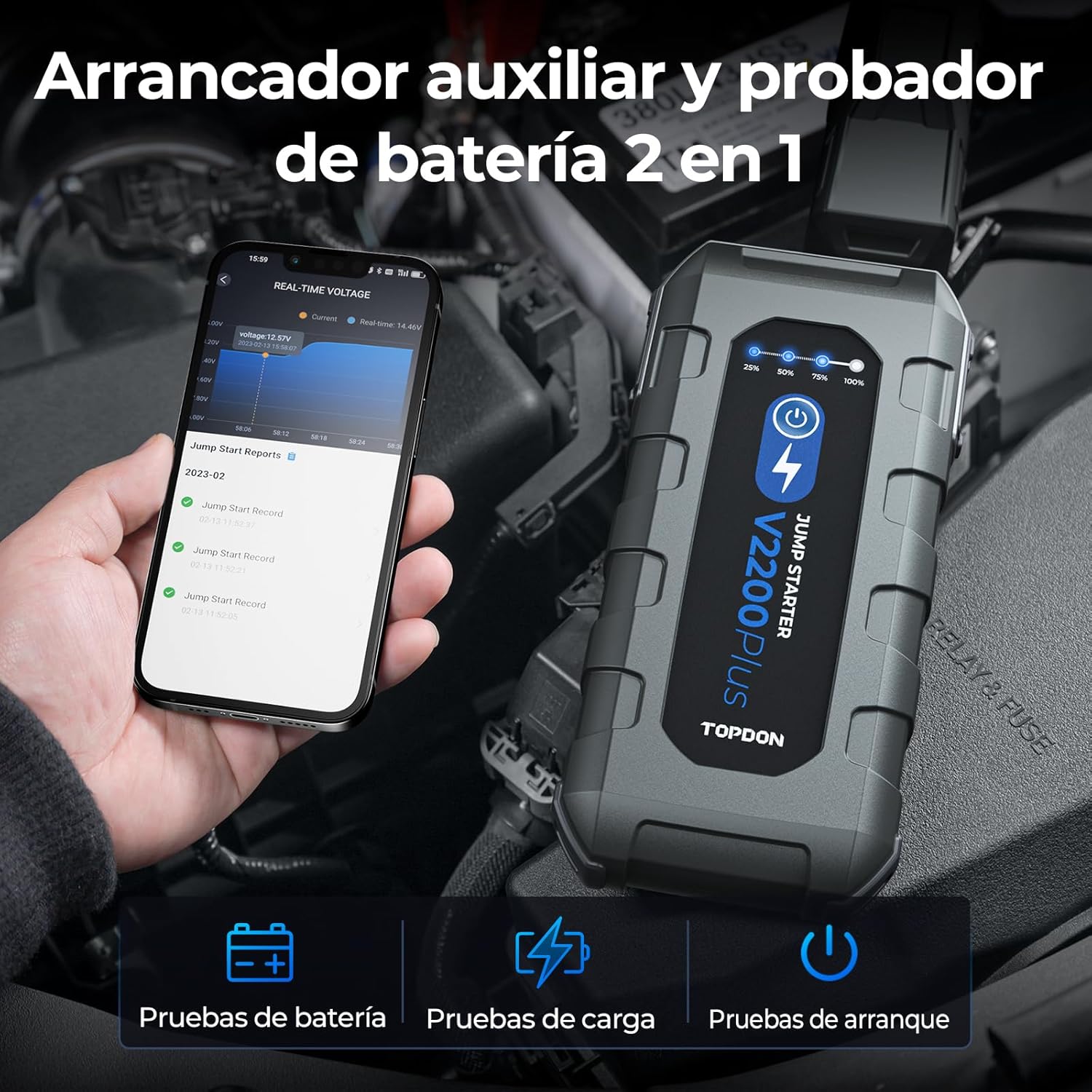 ARRANCADOR Y PROBADOR DE BATERÍA 2 EN 1: El módulo Bluetooth incorporado le permite detectar el estado de la batería a través de la aplicación móvil, obtener un informe detallado de inspección de la batería de nivel profesional y analizar más a fondo el motivo por el cual el automóvil no puede arrancar.