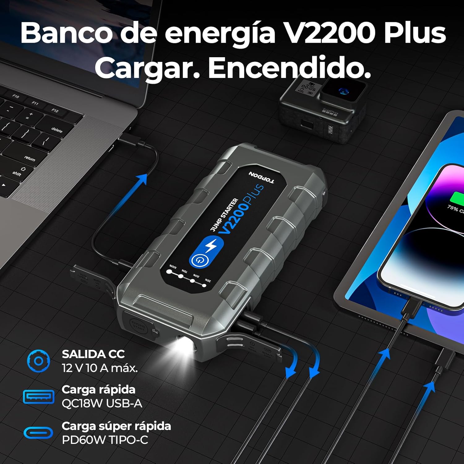 MULTIFUNCIÓN: V2200PLUS es una fuente de alimentación portátil de 16.000 mAh con 2 puertos USB QC de 18 W y 1 puerto CC de 16,8 V. También cuenta con una linterna ultrabrillante de 300 lúmenes y es una baliza SOS para emergencias o aventuras al aire libre. Cuando está completamente cargada, la linterna dura hasta 30 horas.