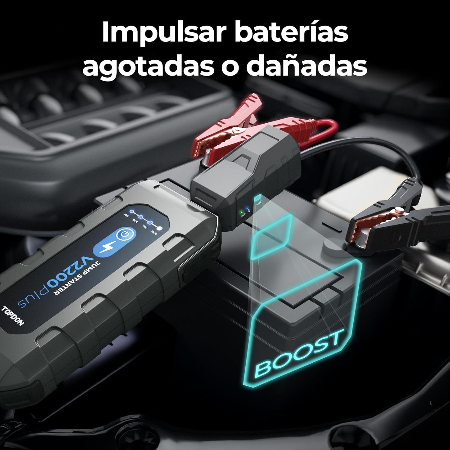 MODO BOOST ARRANQUE BATERÍA MUERTA: El modo BOOST puede arrancar vehículos cuya batería está dañada. Simplemente mantenga presionado el botón de arranque durante 3 segundos para arrancar el vehículo. Si la luz indicadora es verde cuando está conectada a la batería, puede arrancar el vehículo directamente después de conectar las abrazaderas.