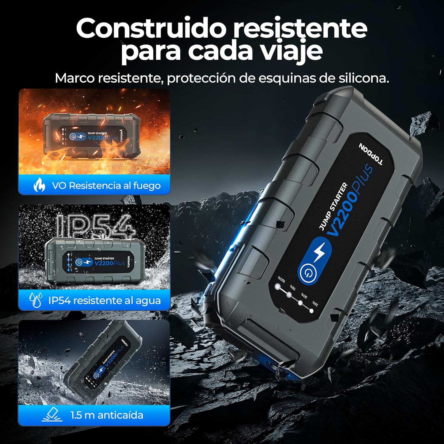 DISEÑO AVANZADO: El cargador/encendedor de batería para automóvil TOPDON V2200PLUS adopta tecnología de litio de alta descarga para un funcionamiento seguro en cualquier clima. El estuche no solo es resistente al fuego V0 y al agua IP64, sino que también tiene una estructura especial con huesos fuertes y protección de silicona en las esquinas para que sea a prueba de caídas y extremadamente duradero para usar mientras viaja.