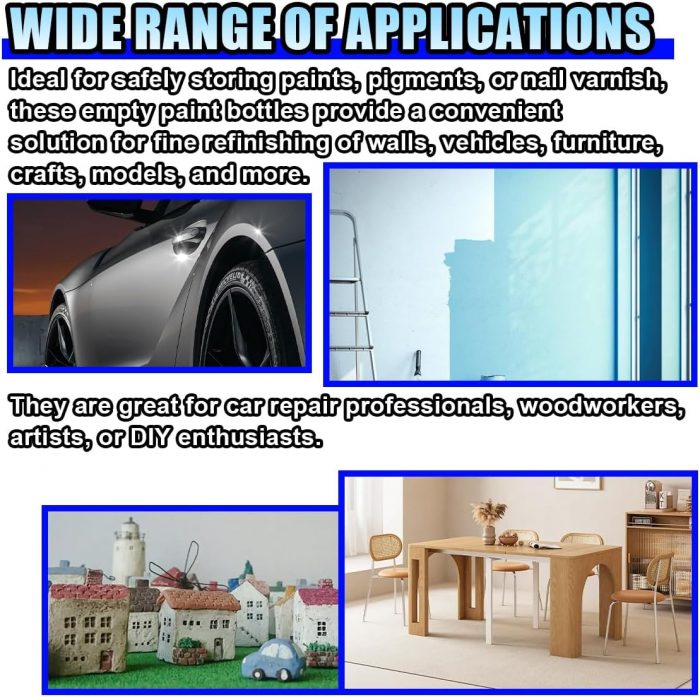 【Broad Applicability】: This empty paint bottle is suitable for vehicle refinishing such as cars, SUVs, or trucks. It is also suitable for fine refinishing walls, furniture, crafts, and porches, which can meet your refinishing needs in different scenarios. This paint refinishing bottle is a handy aid for the automotive repair professional, woodworker, artist, or DIY enthusiast to complete their restoration work.