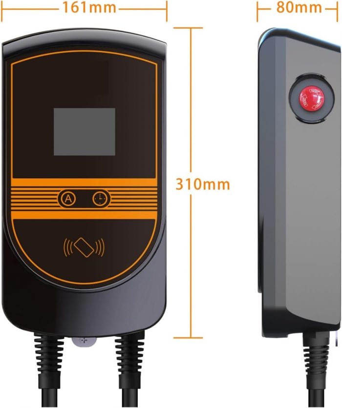 Pantalla grande y pantalla LCD de alta compatibilidad que muestra la corriente de carga, el voltaje de carga y la temperatura. La estación de carga también dispone de un cable de carga de 5 m y está equipada con un enchufe tipo 2. Los tornillos se insertan en la caja, por lo que no tienes que preocuparte de que la pantalla se caiga. El cable de 5 metros de largo deja suficiente espacio entre su coche y la estación de carga.
