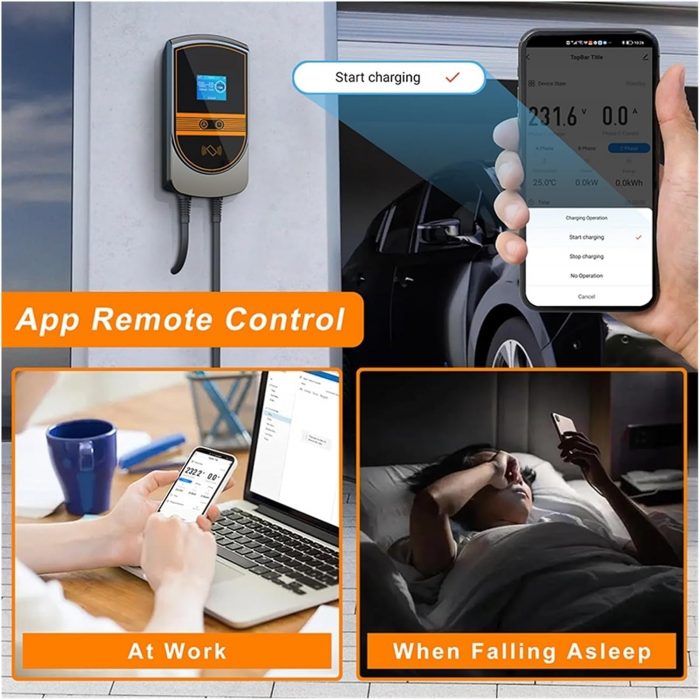 Control remoto a través de la aplicación, puede controlar la caja de pared/estación de carga de la manera más fácil y efectiva, por ejemplo, monitorear la carga, configurar el inicio o la parada del proceso de carga, determinar la potencia de carga o la corriente de carga, leer registros de datos de carga, etc.