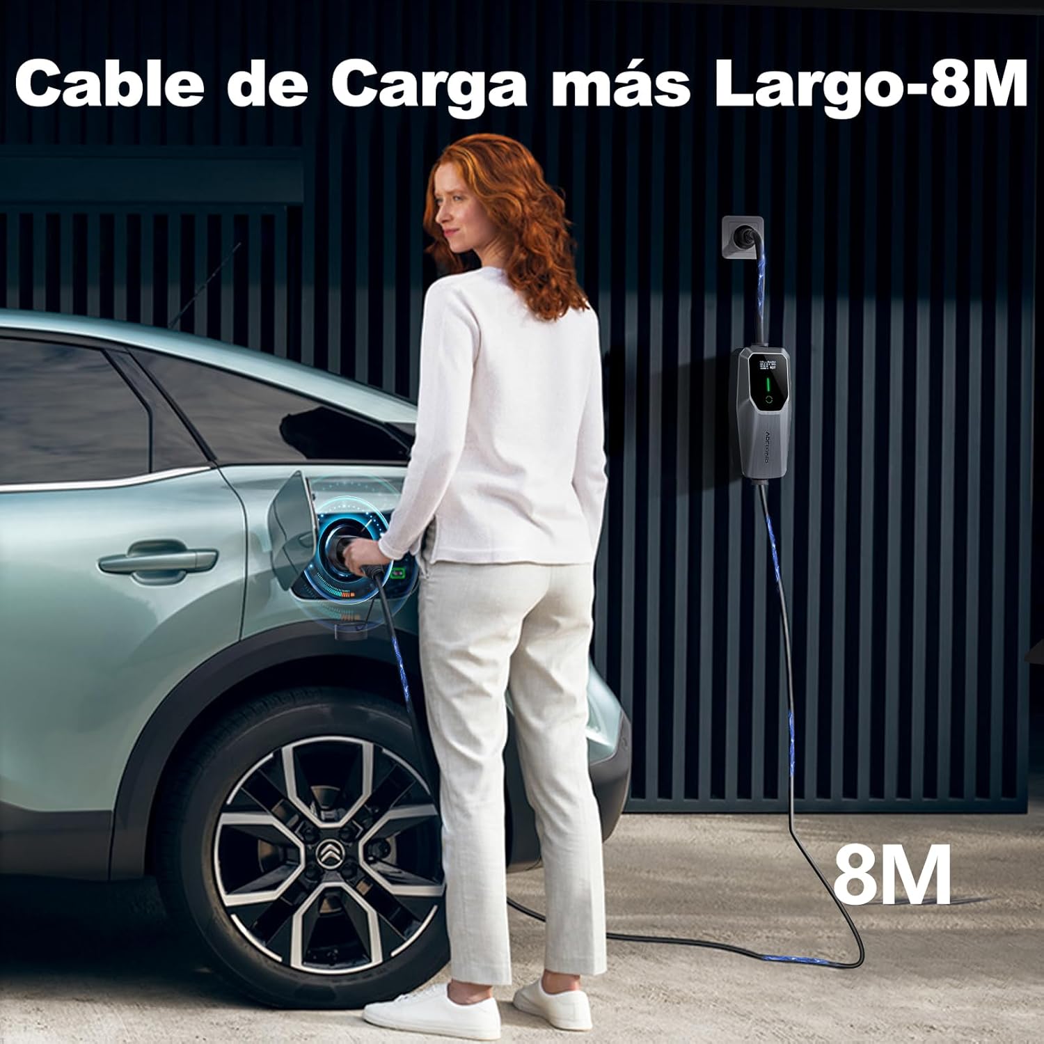【Cable de carga extendido – 8 m】 La versión mejorada del cargador para vehículos eléctricos de 3,6 kW/8 m extiende el cable de carga a 8 m. Este cable es lo suficientemente largo para satisfacer tus necesidades en cualquier situación. Olvídate de preocuparte porque el cable sea demasiado corto. Puedes utilizar el enchufe interior para cargar tu coche en el jardín.