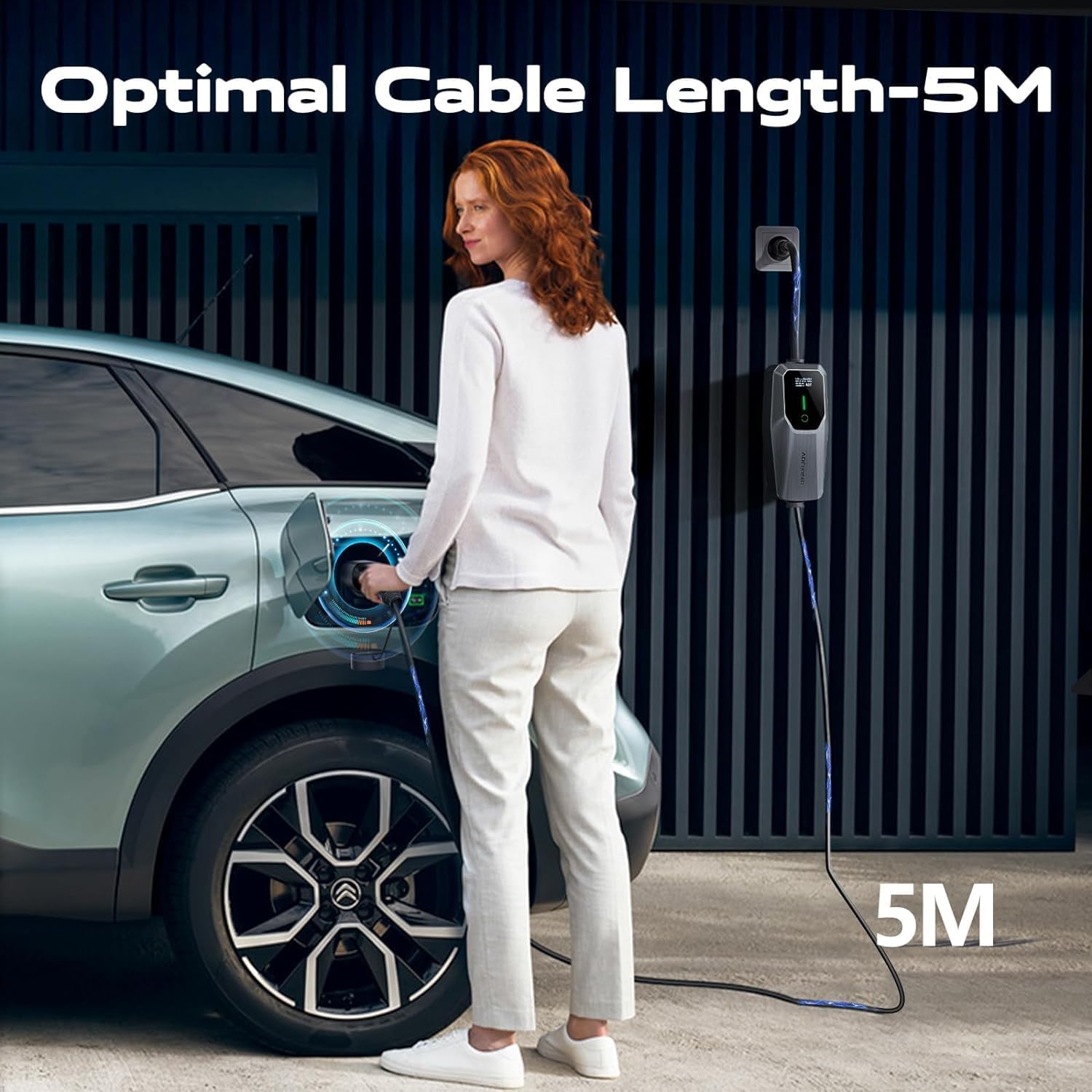 【Cargador Portátil para Vehículos Eléctricos】 El cargador VDLPOWER EV está equipado con un cable de 5 metros de largo, que permite transportarlo con una longitud adecuada sin que sea demasiado largo ni demasiado pesado.
