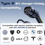 【Compatible con vehículos eléctricos TIPO 2】La interfaz del cargador EV Tipo 2 cumple con la norma europea IEC 62196-2. El cargador ev con interfaz tipo 2 es compatible con MG4, e208/2008 Megane, Twingo, E-C4, GLA, Q3, EX30, XC90, ID.3, ID.4, Fiat 500/600, Model Y, Model 3, Dacia Spring, la mayoría de los coches eléctricos de la mayoría de marcas europeas como e-tron, ZOE, es decir. 3, i4, etc.