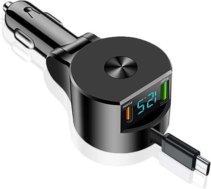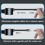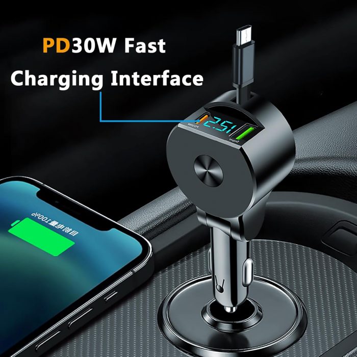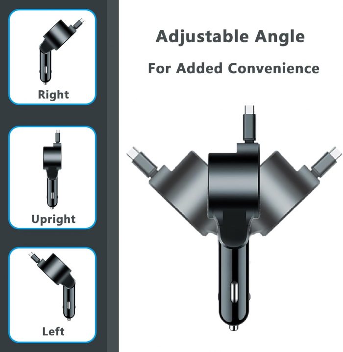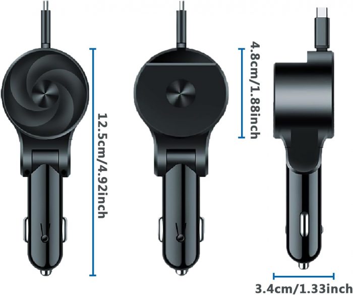 Retractable USB-C Cable & 90° Rotatable Head: car mobile phone charger, no tangling wires. 70cm long cable with power function, just pull and unload. Swivel connector (90°) for flexible connection in any vehicle model. Perfectly organized and space-saving