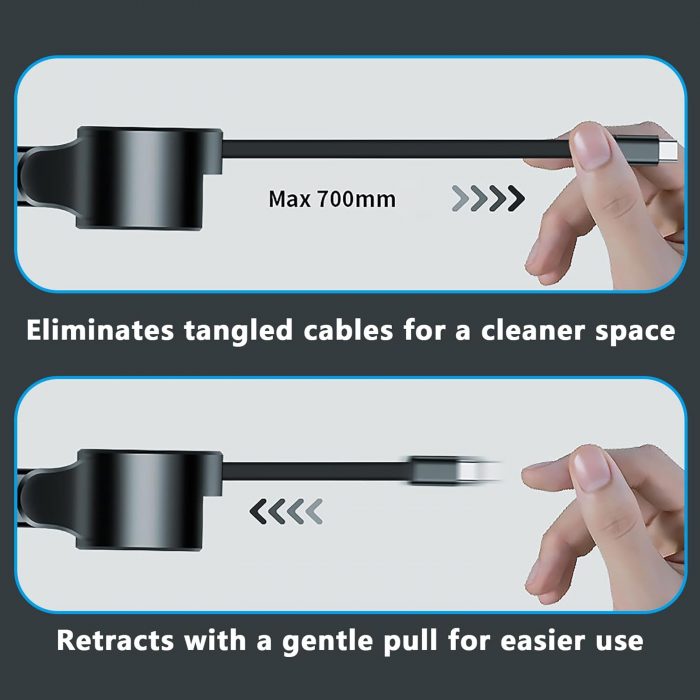 Retractable cord saves space and protects against damage. Just a gentle pull – after charging, the cable disappears elegantly into the case. No more tedious rolling.