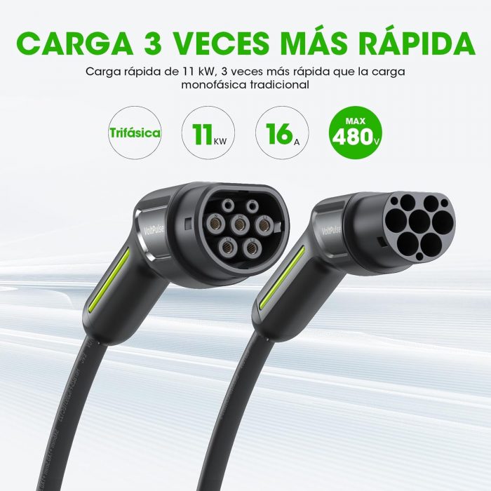 CHARGING 3 TIMES FASTER: The VoltPulse 16A, 11KW, 3-phase, type 2 charging cable charges your EV/PHEV three times faster than a traditional single-phase charging cable. With 16A, three-phase current and a maximum voltage of 480V, you can fully charge your EV/PHEV in just a few hours, saving you time and money.