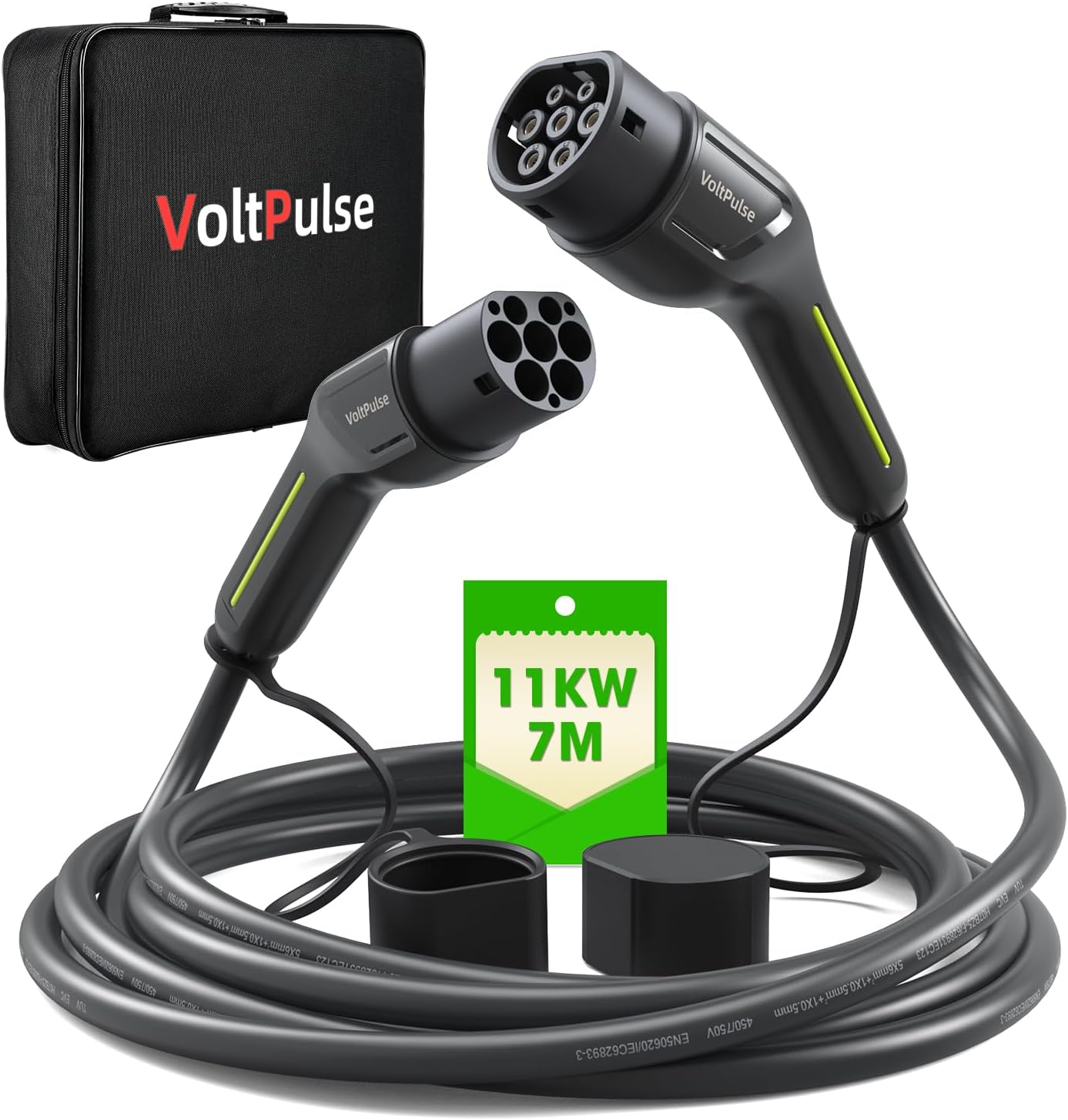 VoltPulse Type 2 Electric Car Charging Cable, 11kW 16A Three Phase 7M EV/Type 2 to Type 2 Plug-in Electric and Hybrid Vehicles with Carry Bag, Compatible with Model 3 Zoe e-Tron