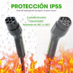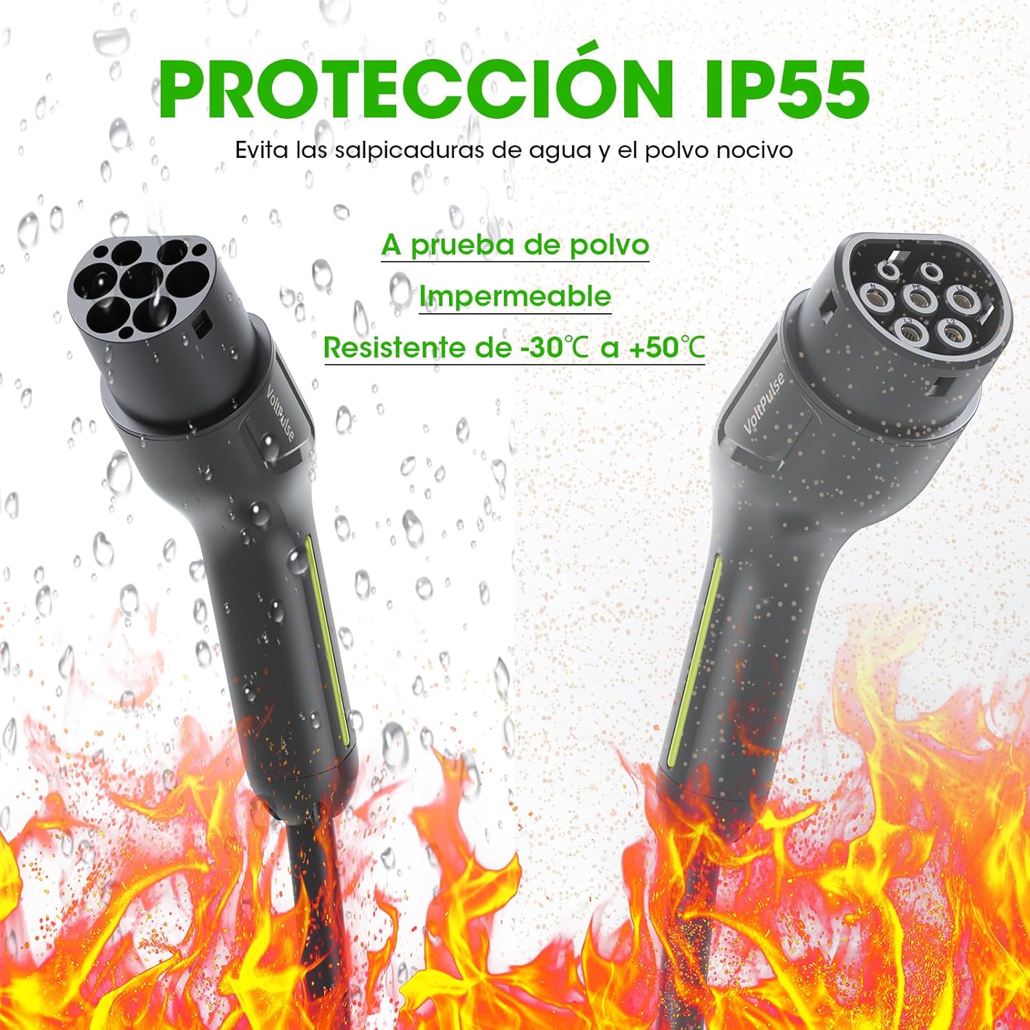 IP55 – Protección nominal: El cable de carga para coche eléctrico VoltPulse tiene la clasificación IP55, que protege el dispositivo conectado del polvo y las salpicaduras de agua. Además, el cable puede soportar un rango de temperatura de -30°C a +50°C, por lo que no tendrá que preocuparse por la carga en la mayoría de las condiciones meteorológicas.6 Protecciones integradas: Con seis niveles de protección contra rayos, fugas, sobrecorriente, sobretemperatura, subtensión y sobretensión, VoltPulse Tipo 2 16A le ofrece tranquilidad.Estándares TUV/CE: El cargador de coche eléctrico VoltPulse cumple con las normas TUV/CE, lo que hace que el cable de tipo 2 sea compatible con todas las estaciones de carga de vehículos eléctricos de Europa.Material de TPU duradero: Fabricado con material de TPU duradero, el cable del cargador de coche eléctrico VoltPulse tiene buena elasticidad, resistencia a las bajas temperaturas, buena resistencia al aceite, a los productos químicos y al medio ambiente. Puede soportar una caída desde una altura de 1 m y una presión de 2 T ejercida por el vehículo.Tapas de goma: ambos extremos del cable de tipo 2 incorporan tapas de goma con anillos estancos para proteger aún más el enchufe de carga, y las tapas de goma se abren parcialmente para facilitar su extracción.
