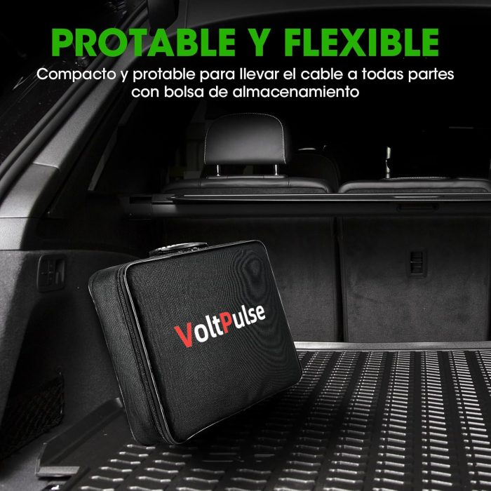 El cable VoltPulse Tipo 2 viene con una bolsa de transporte, que tiene un asa ergonómica para un agarre cómodo, y un revestimiento impermeable en la superficie para proteger los cables, incluso bajo la lluvia.