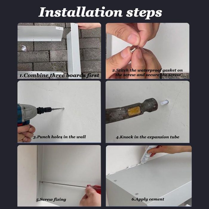 Easy to Install The charging station rain cover comes with installation accessories. Drilling is required for installation. 1. Assemble the rain cover, fix it with screws and install it on the wall. 2. Once installed, cover the top edge of the awning with the cement layer provided. It is not only beautiful, but also prevents rainwater from penetrating through the cracks.