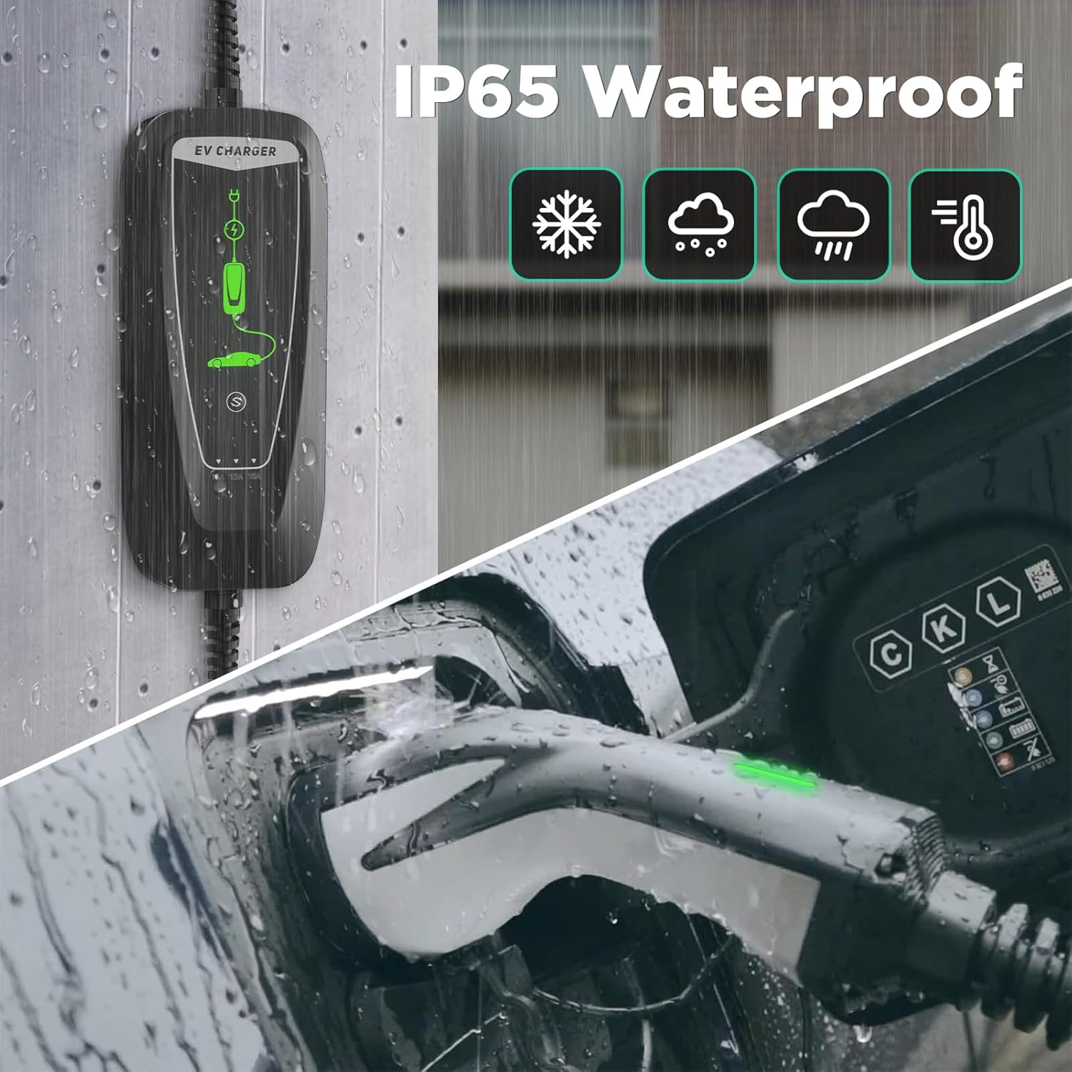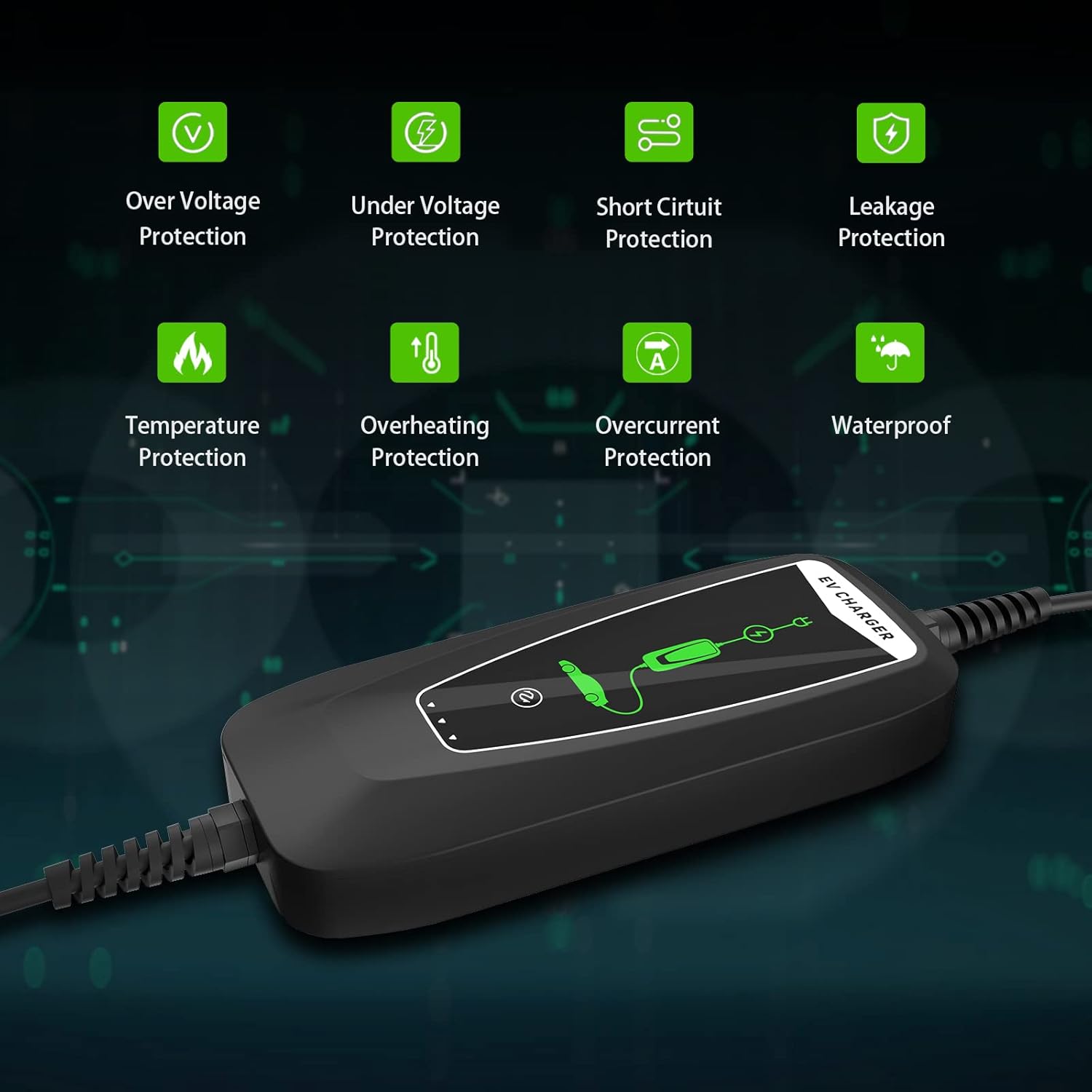 MÁXIMA SEGURIDAD: la estación de carga portátil para vehículos eléctricos cuenta con protección contra sobrecorriente, protección contra sobretensión, protección contra bajo voltaje, protección contra fugas, clasificación IP66 a prueba de agua y polvo, protección contra sobrecalentamiento, certificación CE y TUV obtenida, es absolutamente segura y confiable