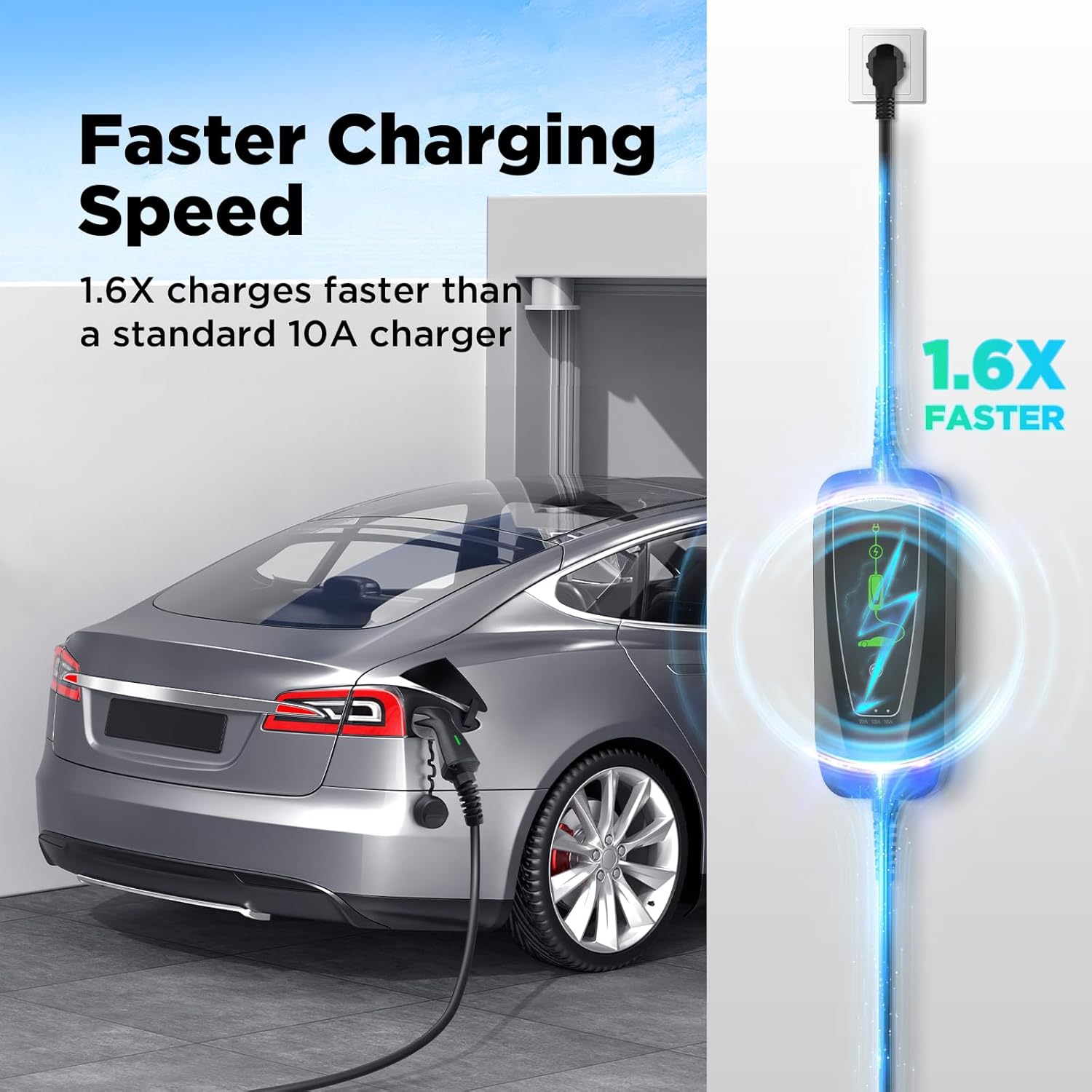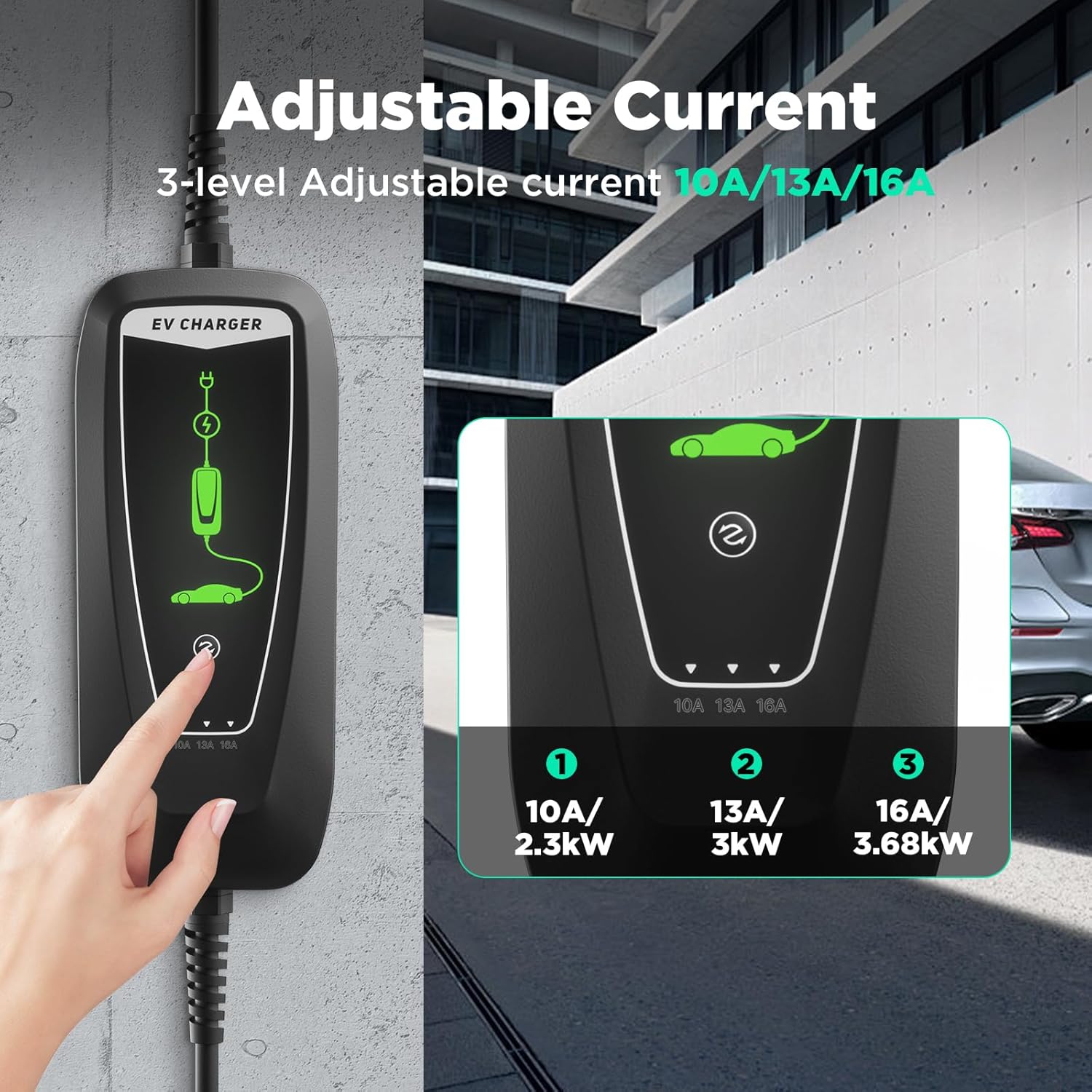 Dé Cargador de Coche Eléctrico 3,7kW (7 m, 6/8/10/13/16A) Cargador de Vehículo Eléctrico Portátil con Montaje en Pared, Pantalla LCD Digital, Controlable para Modelo Y/3, GLC, A250, GLA, Q3 y Otros EV/PHEV