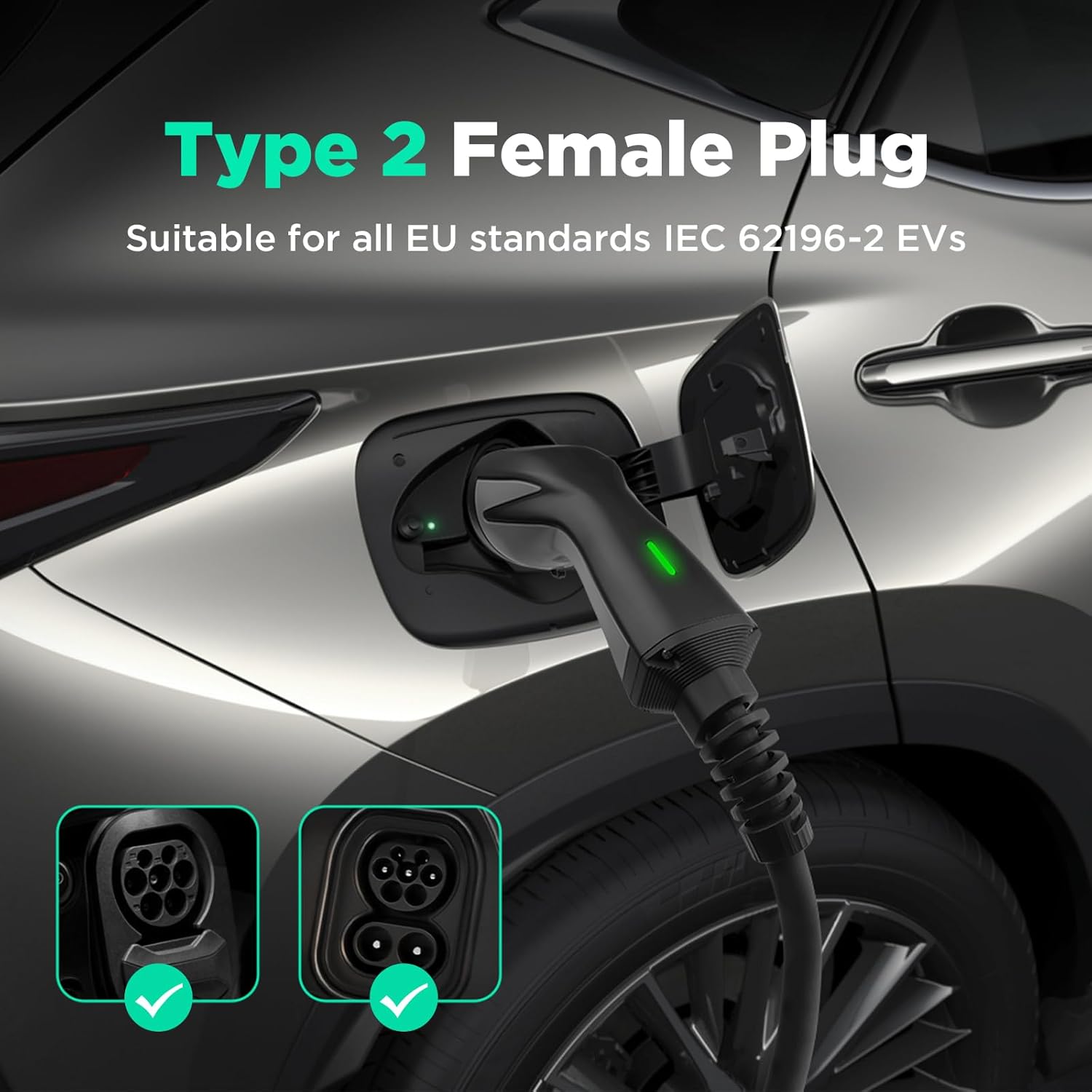 Carga cómoda y rápida: nuestro cargador de coche eléctrico tipo 2 con enchufe IEC 62196-2 puede satisfacer sus necesidades de carga diarias. Para llevar con tu coche en tu viaje o de camino, sólo necesitas un enchufe Schuko. La corriente conmutable 10A/13A/16A puede cumplir con diferentes pantallas de carga, más rápido que los cargadores convencionales.