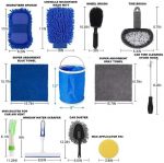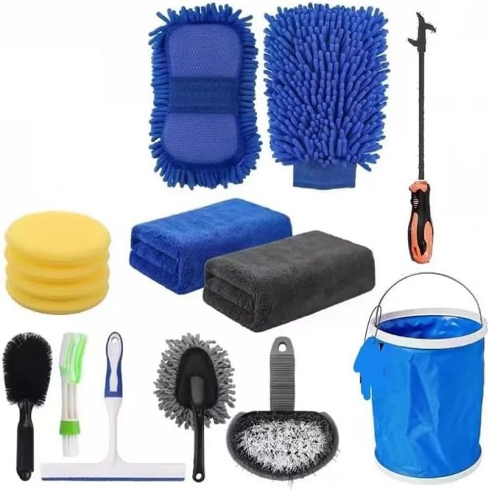 ⭐ 【Potente juego de limpieza de coches】Cubo plegable*1, guantes de limpieza de fibra fina extra grandes, esponja de limpieza de fibra*1, toalla absorbente*2, raspador de vidrio*1, cepillo para neumáticos de coche*1, cepillo para neumáticos con mango*1, cepillo para quitar el polvo de la ventilación*1. Gancho para piedra de limpieza de neumáticos de coche*1, cepillo para polvo de coche*1, almohadilla de encerado*4.