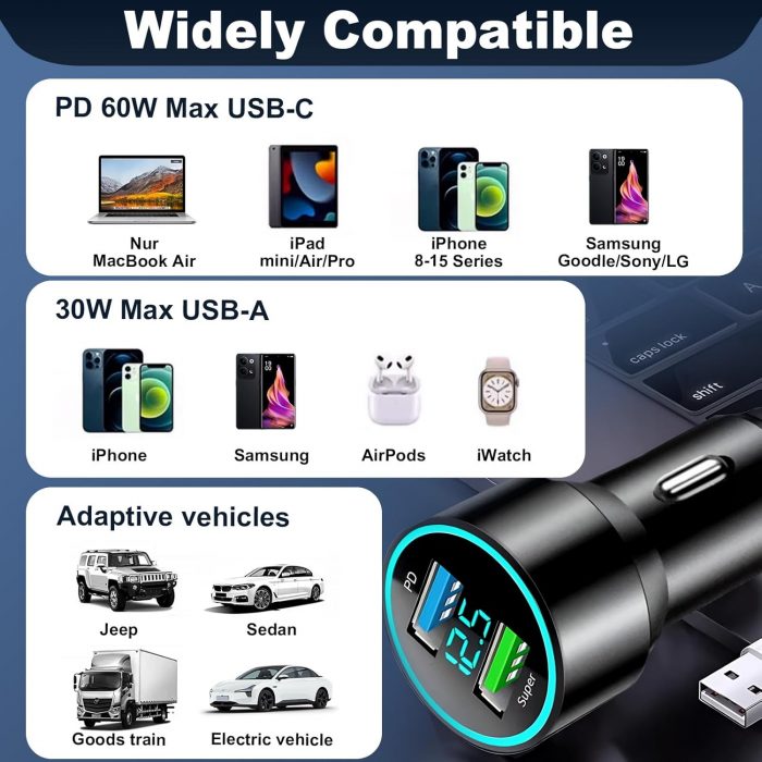 Wide and universal compatibility: The mobile car charger is fully compatible with devices such as iPhone 16/15/14/13/12, Samsung Galaxy S25/S24/S23/S22/S21, iPad, and more. Works with USB-C and Lightning phones, as well as tablets and other electronics