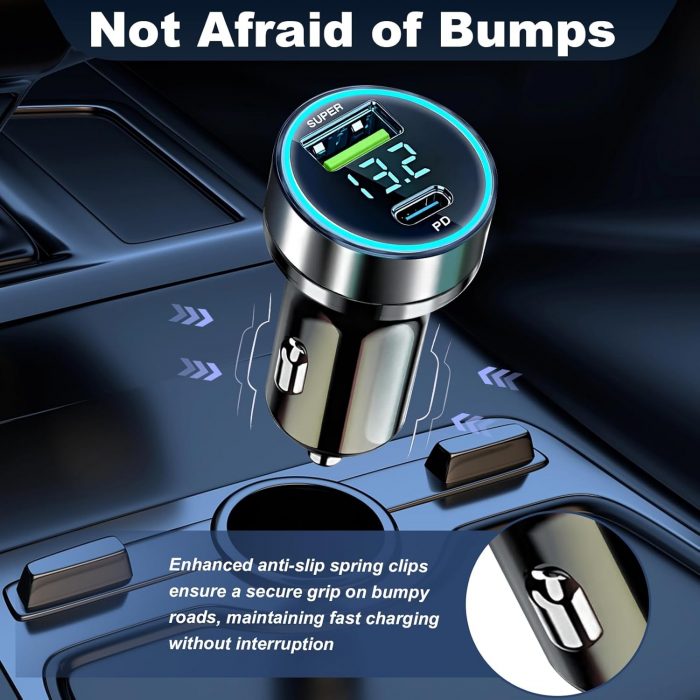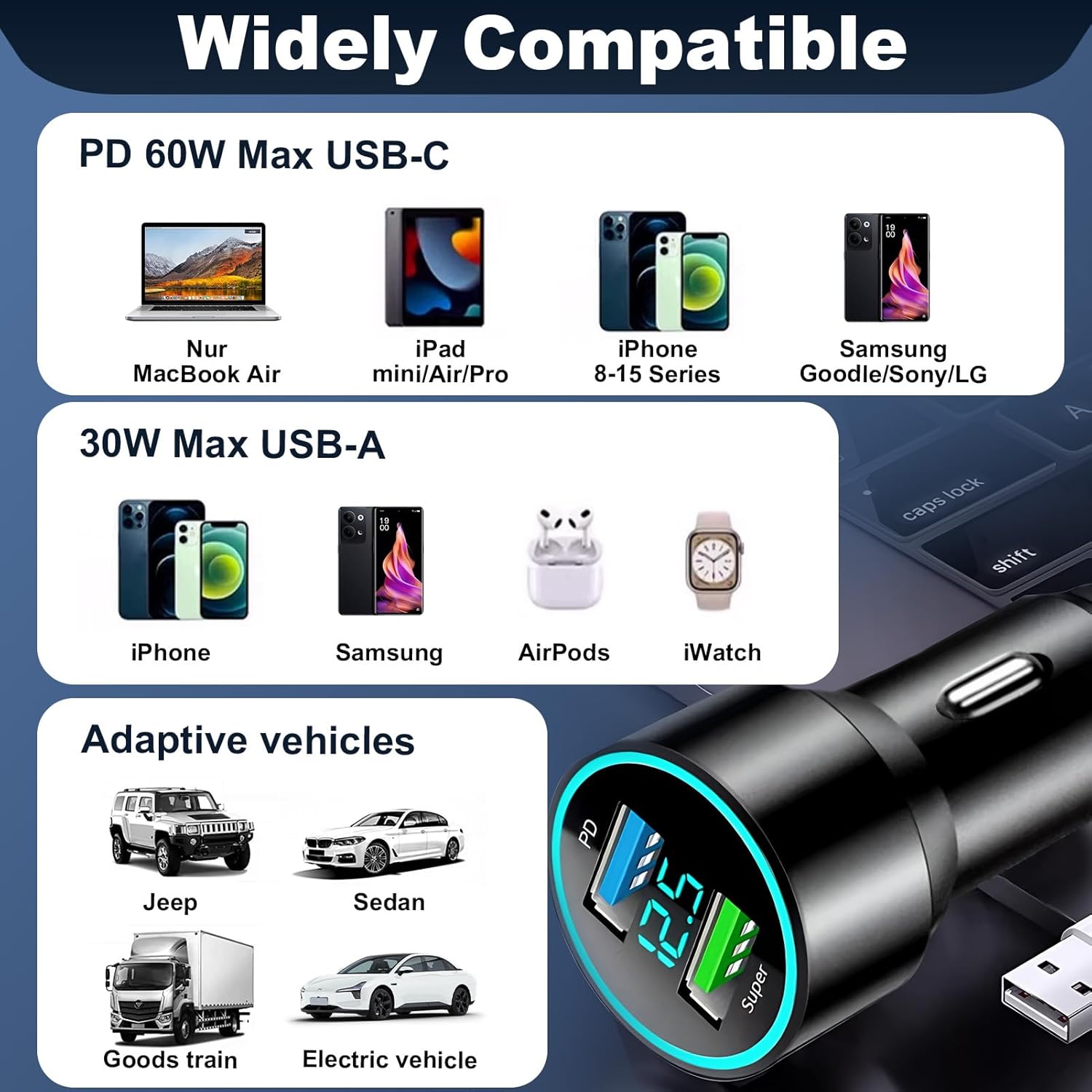 Dual Port for Convenience: This 60W USB C Car Cigarette Lighter Charger offers two ports to charge two devices simultaneously without losing power. Great for family trips or shared use, even in the back seats of the car